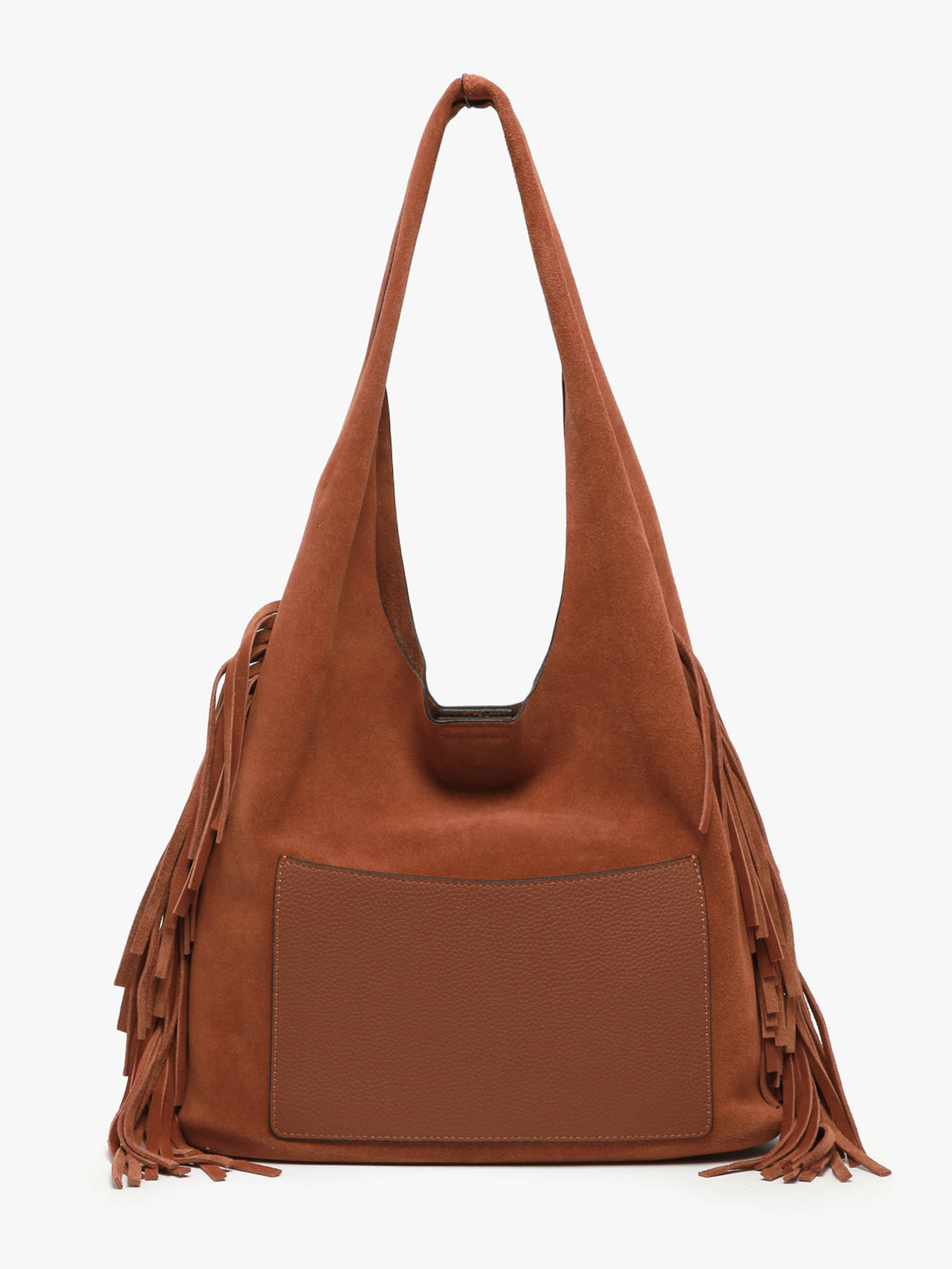 The ETRIER shoulder bag from the COUNTRY line is made of velvety leather. This small M-sized hobo silhouette stands out with its side fringes and bold bohemian style. It features a smooth leather slip pocket on the back. The bag closes with a magnetic snap. Inside, a removable pouch helps organize your essentials. This compact model embodies a free and elegant spirit — perfect for adding warmth, character, and authenticity to your winter outfits.
